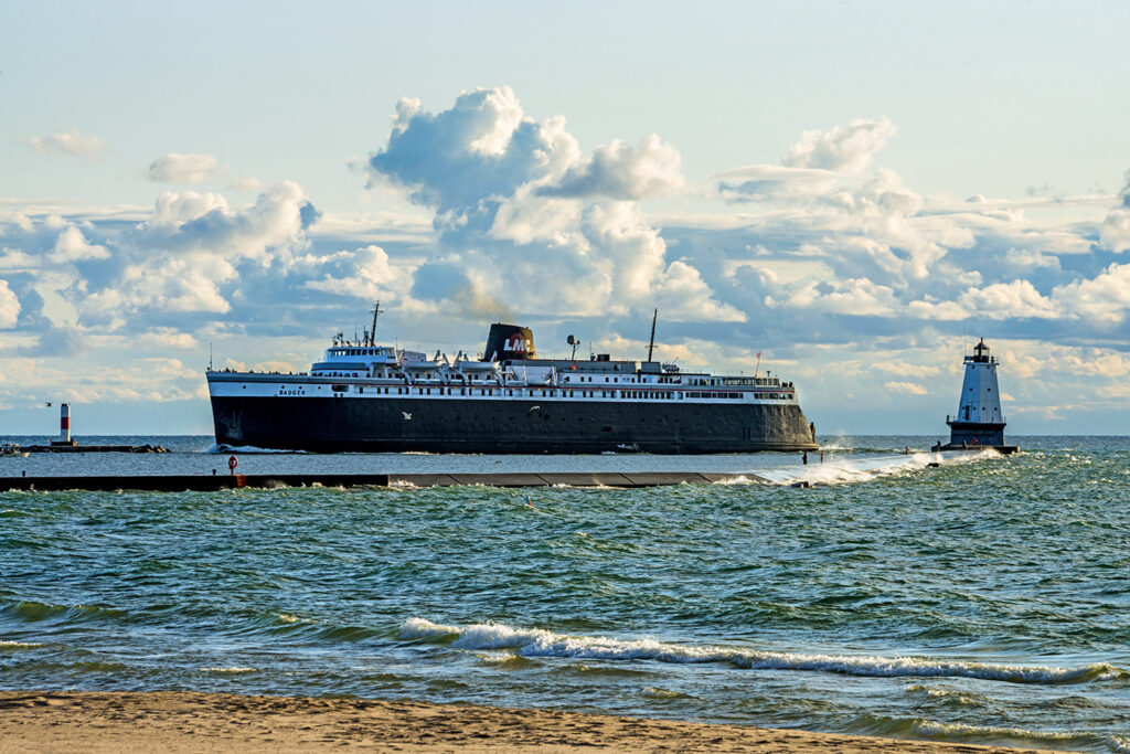 This 410′ ship carries up to 620 passengers and 180 vehicles. Onboard you can play Badger Bingo, watch a movie, shop, or enjoy a meal in one of their two restaurants. Kid’s activities include a video arcade, coloring contests, and playroom. The best part of the journey is sitting on deck and enjoying the view–including spectacular sunsets. The S.S. Badger is on the National Register of Historic Places. Read about the best places to watch the carferry sail and helpful hints when arriving by the carferry.