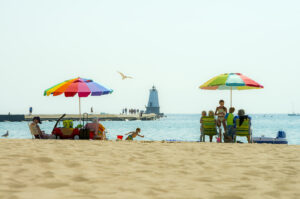 At the end of Ludington Avenue is Stearns Park Beach with 2,500 feet of sandy shoreline. Here you can enjoy a large, grassy area with abundant picnic tables and grills and and parking is always free. Stearns Park Beach also features the North Breakwater Light, miniature golf course, shuffleboard, playground, and skate park. Concessions and restrooms at both ends of the beach are open daily in the summer.