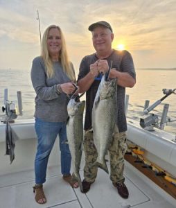 Lake Michigan — Had another great trip with Mike and Wendy!!!! Started out a little slow then picked up in a hurry!!! Fish came suspended on a 7 color leadcore and off bottom with spin n glows behind chrome and gold dreamweaver spin doctors!!!! Give me a call the fishing is very good and the weather is heating up!! (800)-850-1978 — Reported by Captain Mike Darke on 5/8/21.
