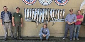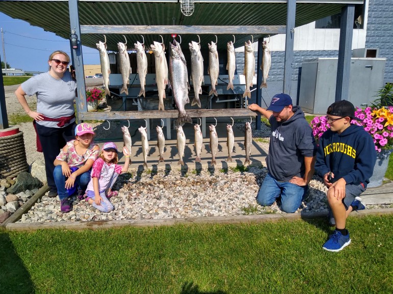 Lake Michigan — Chinook salmon were caught northwest of town and at Big Sable Point in 100 to 180 feet of water while fishing 40 to 90 feet down. Although slower, a few Chinook salmon were also caught off the projects to the south in 100 feet of water. Green, UV and bloody nose pattern worked well, along with some flasher/fly combinations. Many small Chinook salmon have been reported, and in the mix came a couple suspended lake trout. A nice steelhead was also reported to be caught on the pier while using spawn. Reported by the Michigan DNR on 5/15/24.Lake Michigan — Afternoons, yup…. We offer mornings and afternoons aboard the Lie A Lot!! We set up as we have the last few trips south out of Ludington Pier Heads in 50′ of water. The morning rain finally ended but the ensueing fog made seeing shore impossible. Lucky for us the fish didn’t mind and we preceeded to catch their 12 trout!!!! Best rigs continue to be a Dreamweaver chrome spin doctor 8″ with either blue or yellow spin and glows on or just off bottom!!!