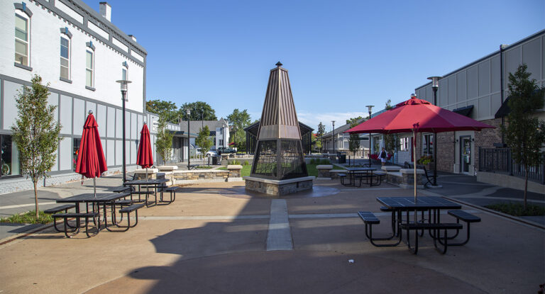 Surrounded by local shops and restaurants, the plaza features a pavilion, restroom facility, entertainment stage, a gas fireplace, seating, and decorative lighting.