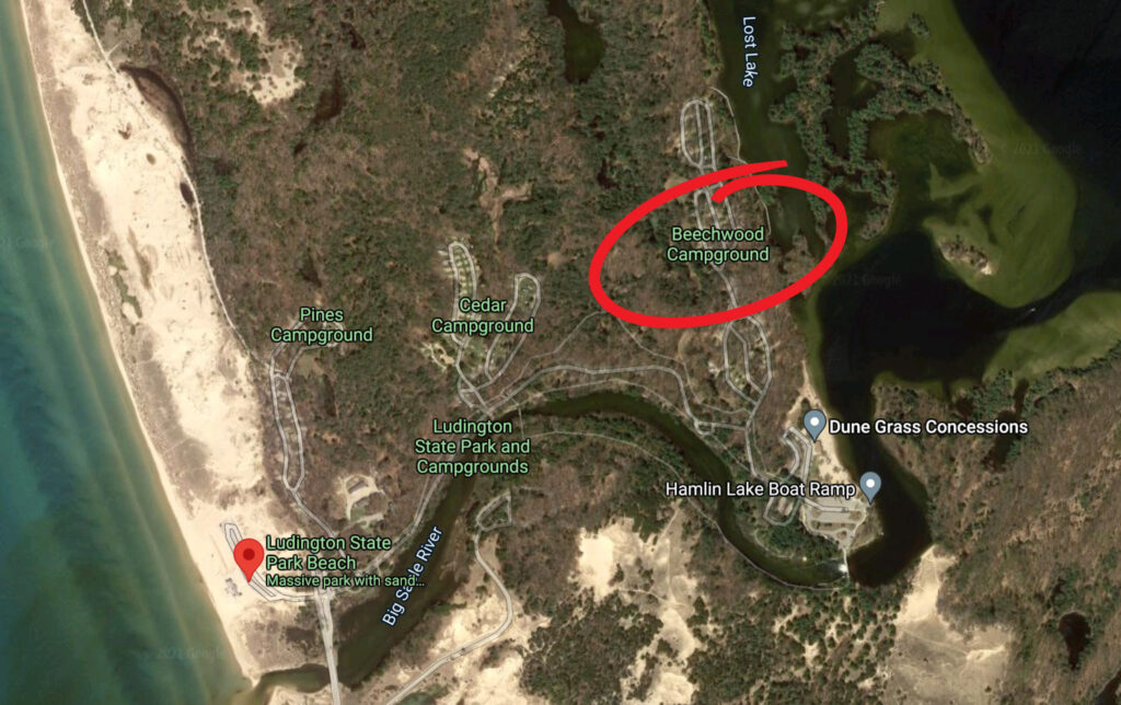 The Beechwood Campground is closest to the Hamlin Lake Beach. There are 147 modern sites with electricity (some sites have 50 amp service), modern showers & restrooms, mini-cabin, playground, recycle center, and certain sites that are handicap accessible. You can access the Lost Lake Trail from the northern section of the campground and the Coast Guard Trail from the middle section. There is also a boardwalk on the eastern side of the campground.