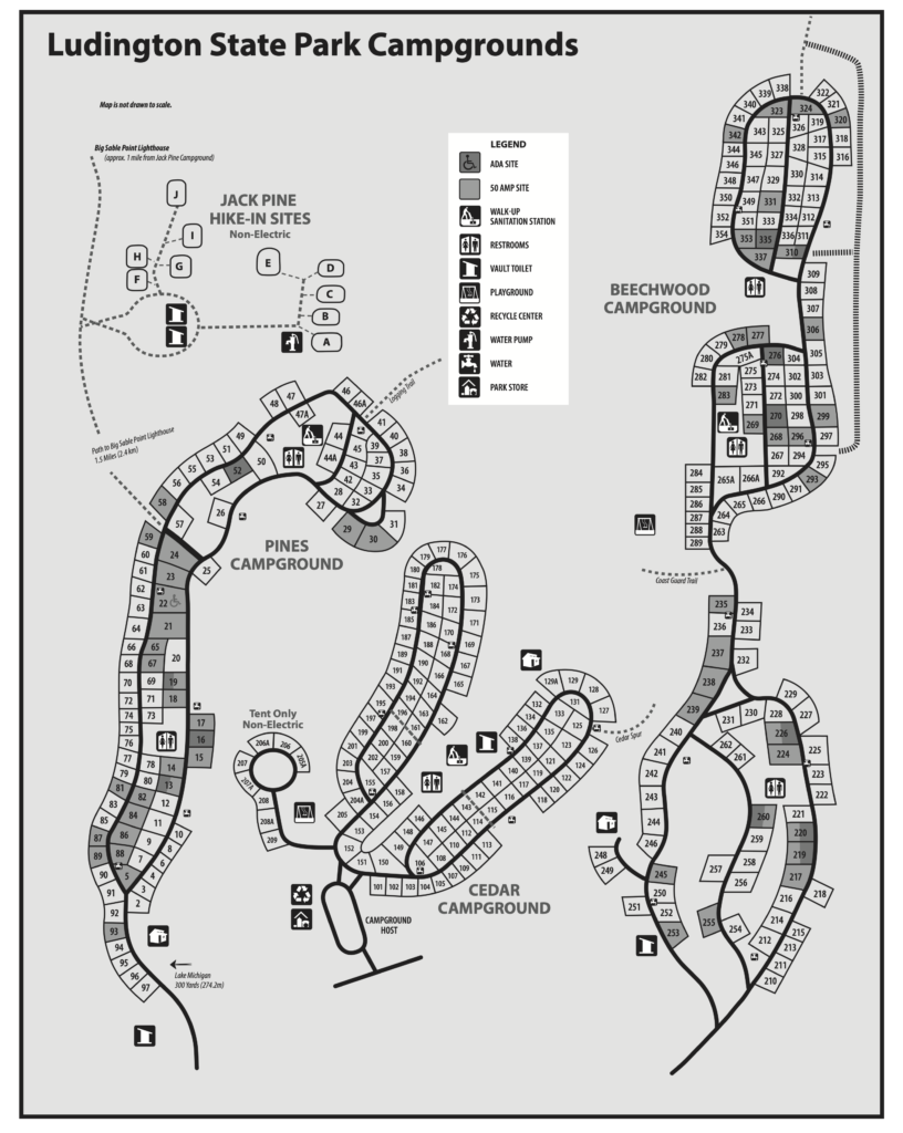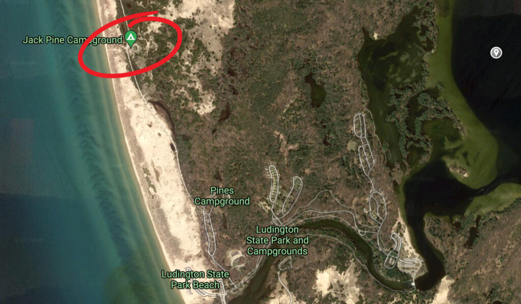 The Jackpine Campground is for hike-in only and there are 10 remote tent sites. There is no electricity and restrooms are rustic. Supplies must be bicycle packed or backpacked in one mile from the designated parking area. Location is north of the Pines Campground and is one mile from Big Sable Point Lighthouse.